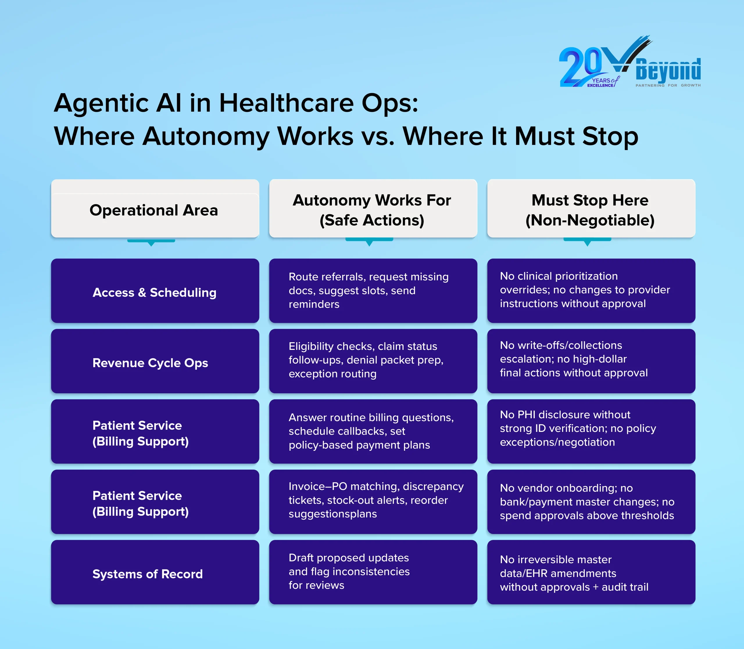 AI autonomy should stop at clinical judgment, irreversible record changes, identity and consent actions, and major financial decisions. These areas need clear human authority because the risk is too high.